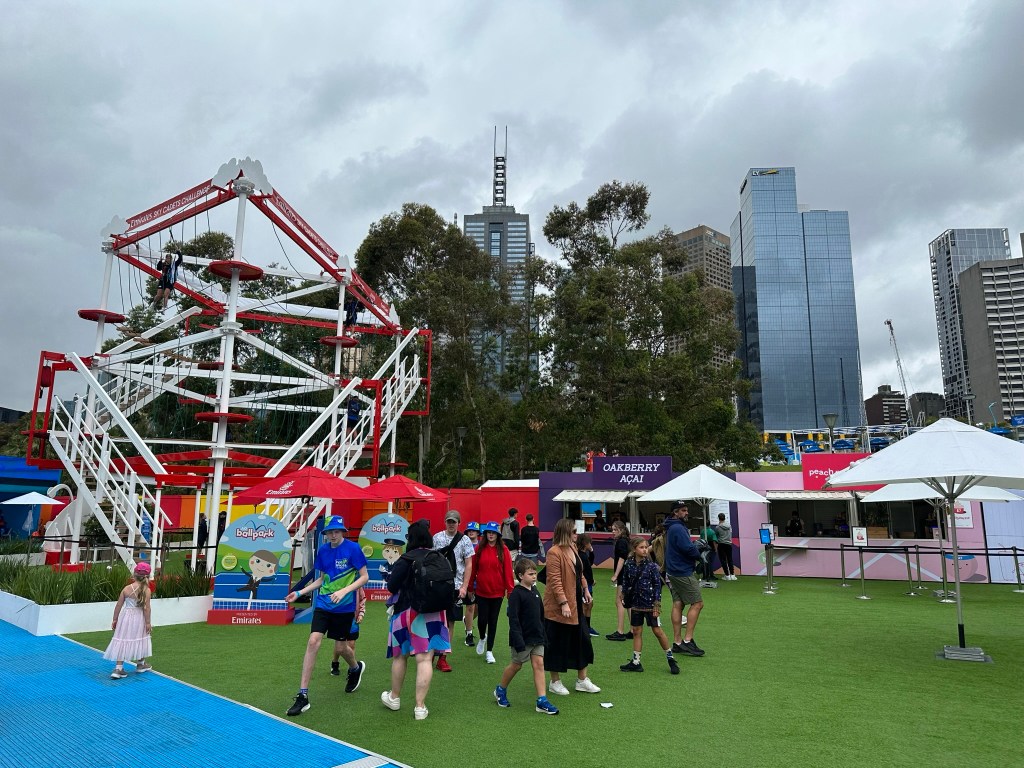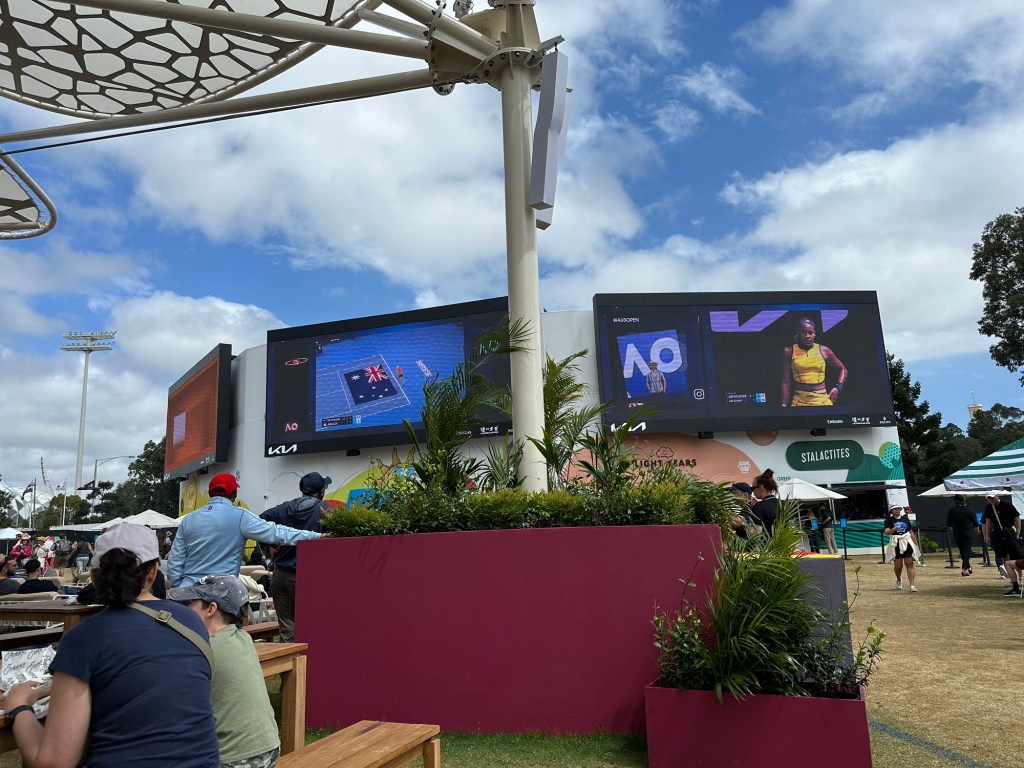 Das Tennis Turnier in Halle haben wir schon mehrmals besucht, also dachten wir zu wissen, worauf wir uns ungefähr einstellen konnten. Dass es dort ein wenig größer sein wird haben wir erwartet, doch wir wurden trotzdem überrascht. Denn die Anlage ist riesig. Eine eigene Kleinstadt mitten in Melbourne. Hinter dem Eingang steht man im Grand Slam Oval. Hier wird fürs leibliche Wohl gesorgt. Außerdem werden hier die Spiele aus den Stadien für die man ein extra Ticket benötigt live auf drei riesigen Bildschirmen übertragen.